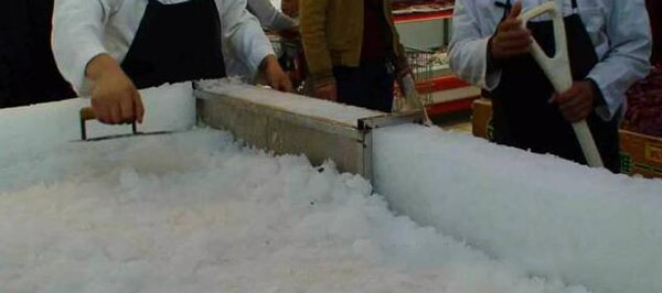 5. 由于水分的蒸發(fā),長時間陳列在冰臺上的魚會變干不新鮮,所以要經(jīng)常用冰鹽水噴到魚的身上,這樣在燈光的照射下,魚會顯得更有光澤和更有新鮮感。同時,還要經(jīng)常把淺埋在碎冰中的魚提動一下,以免由于冰水的逐漸融化,將魚與冰臺凍結(jié)在一起。