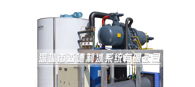 片冰機主要由壓縮機、膨脹閥、冷凝器、蒸發器組成,形成一個循環封閉的制冷系統。片冰機蒸發器為垂直豎立的桶裝結構,主要由冰刀、主軸、灑水盤、接水盤組成。它們在減速機的帶動下,逆時針緩慢旋轉。水從片冰機蒸發器的進水口進入分水盤,通過灑水盤,將水均勻的灑在蒸發器內壁,形成水膜;水膜與蒸發器流道中的制冷劑進行熱交換,溫度迅速降低,在蒸發器內壁上形成一層薄冰,在冰刀的擠壓下,碎裂成片冰,從落冰口掉入儲冰庫。部分未結成冰的水通過接水盤從回水口回流到冷水箱內,通過冷水循環泵進入下一個循環。
